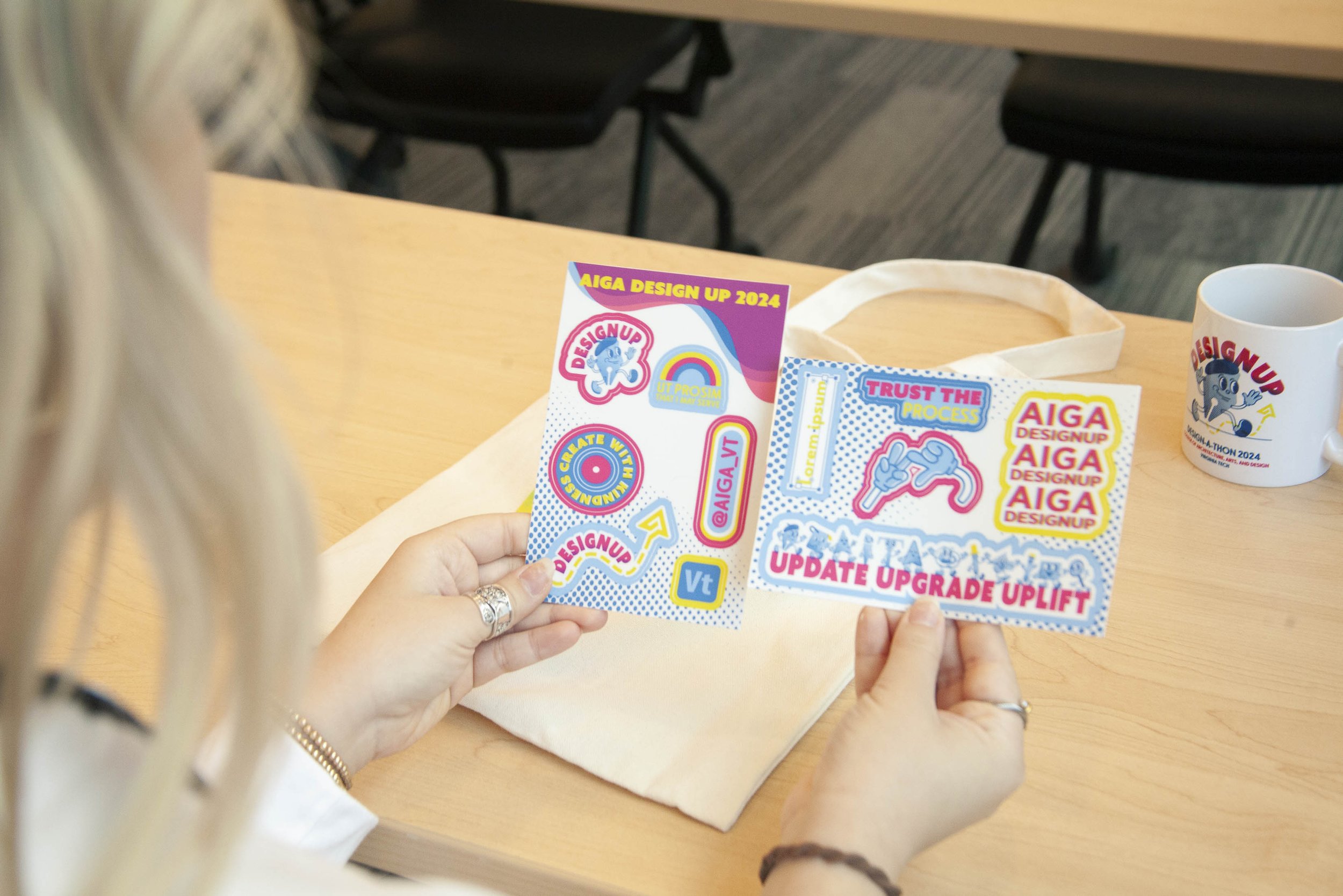 DesignUP is a Design-A-Thon held every year in the Virginia Tech Graphic Design Department. In a single day, teams of graphic design students led by industry professionals, design materials ranging from websites to logos for local non-profits, in celebration of Virginia Tech’s motto of Ut Prosim (that I may serve). In 2024, the leadership team worked together to create the branding material for this event, with my individual role being merchandise design.